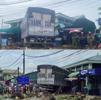 Chiếc xe tải bất ngờ mất lái lao vào cổng chợ Tân Long bên quốc...