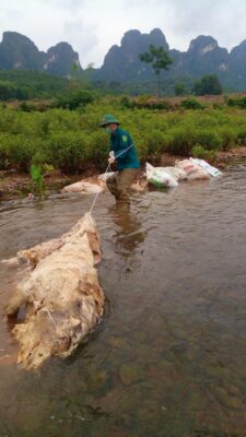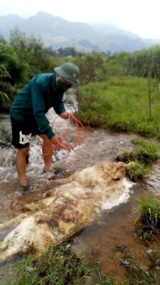 Thời gian gần đây, trên mạng xã hội ở tỉnh Hòa Bình cũ (nay là Phú Thọ), thường xuyên xuất hiện hình ảnh về một người đàn ông gần 50 tuổi một mình mò mẫm ở các con sông, suối kéo vớt các xác lợn trôi nổi trên sông rồi đem chôn lấp khiến nhiều người tò mò.