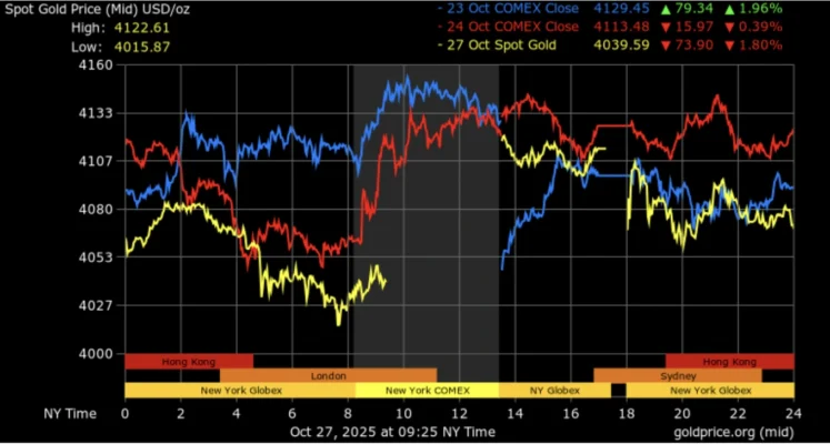 Giá vàng thế giới giao ngay vừa giảm khoảng 2% xuống sát mốc 4.010 USD/ounce. Giới quan sát nhận định rằng nguyên nhân chủ yếu đến từ tiến trình đàm phán thương mại Mỹ – Trung Quốc, khi Tổng thống Donald Trump đang có chuyến thăm châu Á với nhiều cuộc gặp cấp cao.