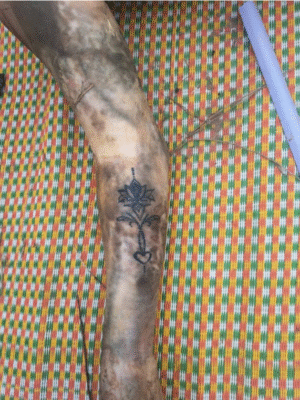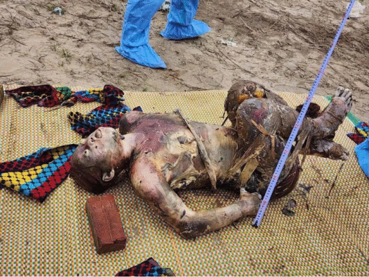 Vào hôm phát hiện, 11/11, thi thể đang trong quá trình phân hủy, khó nhận dạng; có xăm dòng chữ “19-12-2006”.